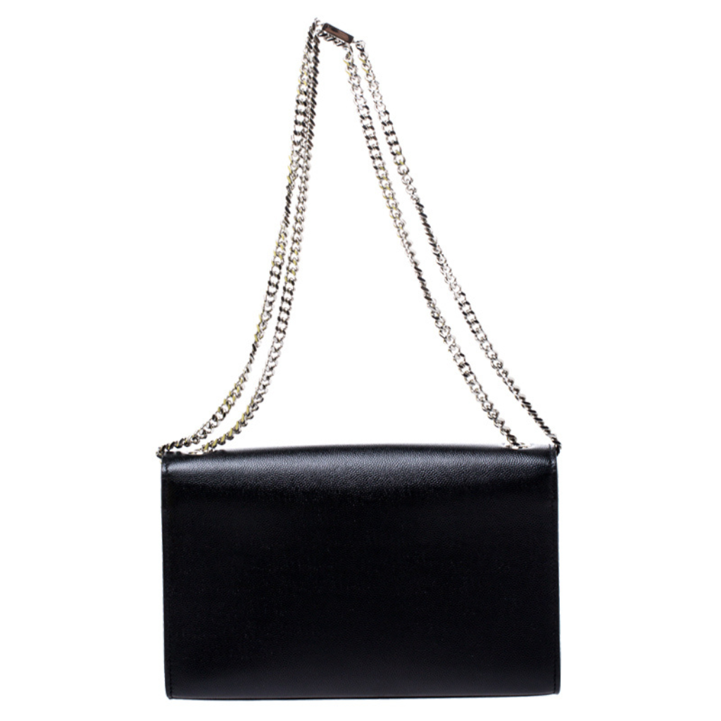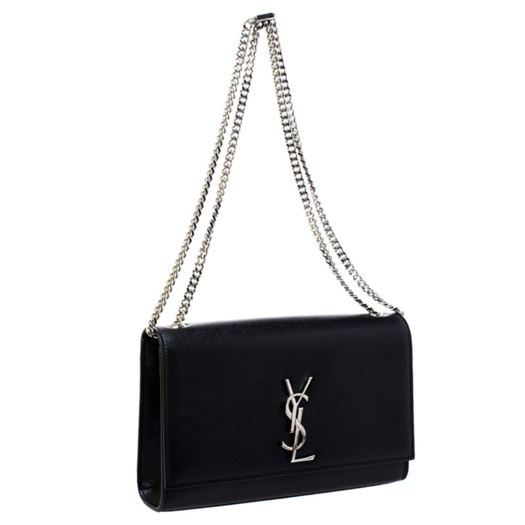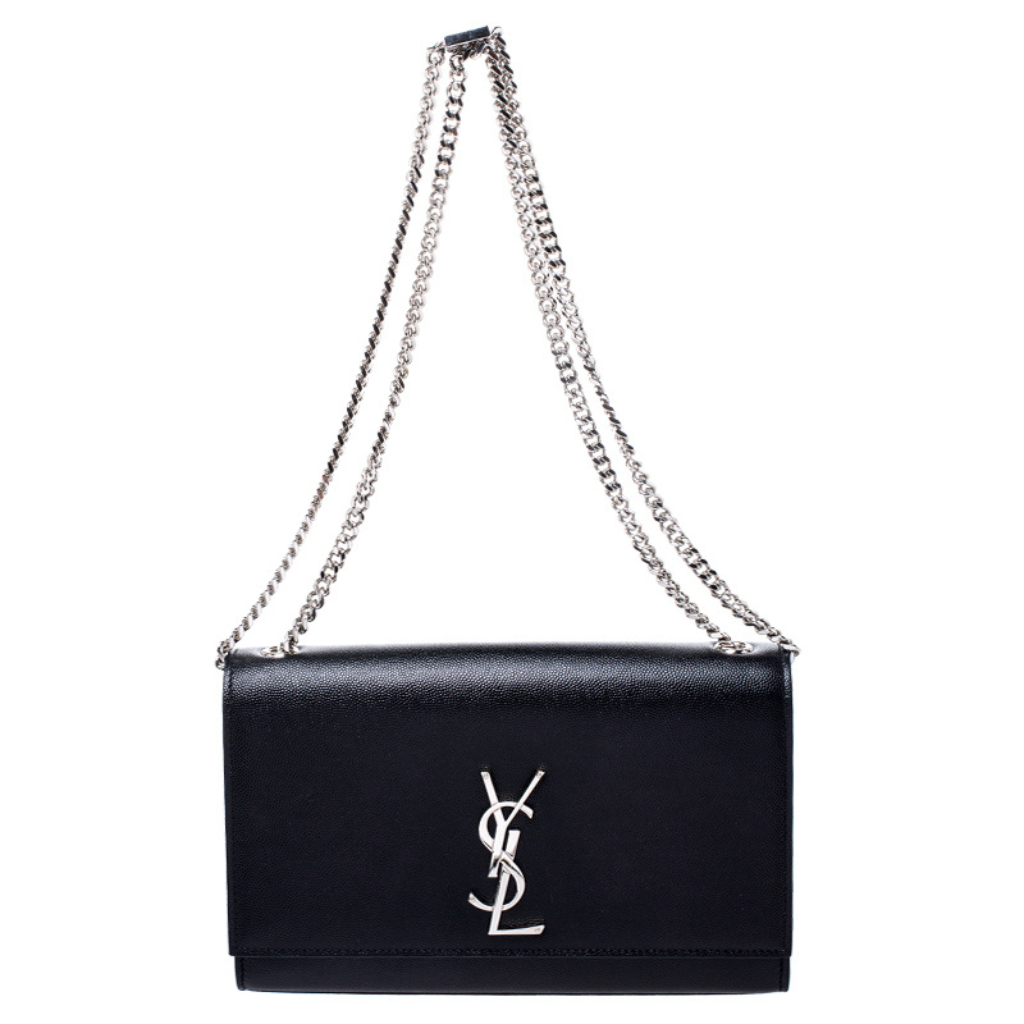 SAINT LAURENT’s ‘Kate’ bag is a such a classic style investment. This version has been made from black embossed-leather and embellished an iconic ‘YSL’ logo Slip it on your shoulder and match your jewelry to the signature hardware.